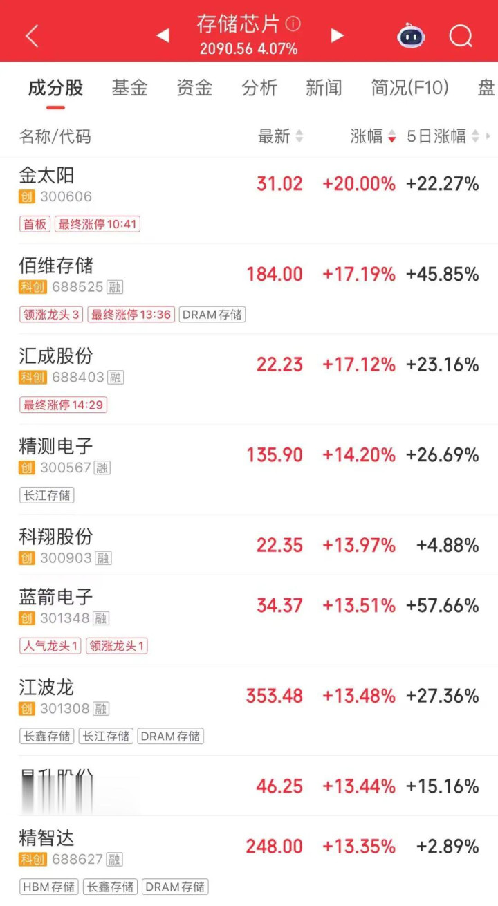 今日,半导体产业链继续大涨,存储芯片股表现强势,午后持续拉升。截至收盘,金太阳“20CM”涨停,兆易创新、通富微电、盈新发展、康强电子等多只个股涨停,佰维存储、精测电子、江波龙、精智达等大涨超13%。