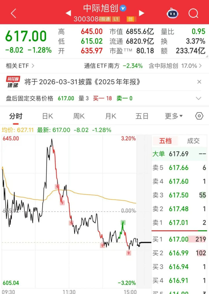 CPO概念龙头中际旭创股价今日早盘快速拉升,一度涨超3%,午后震荡走低,收盘跌1.28%,全天成交额达到233.74亿元,居A股第一。昨日,中际旭创成交额也是A股第一,临近尾盘一度涨超7%,收盘涨5.4%。