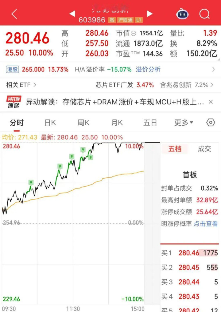 兆易创新午后涨停,收盘股价报280.46元/股,创历史新高,最新市值为1954.1亿元,成交额达到150.2亿元。