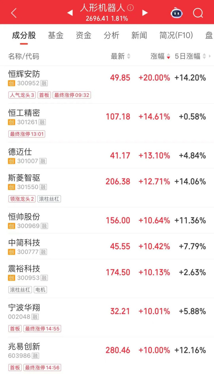 今日午后,人形机器人概念震荡走强,截至收盘,恒辉安防“20CM”涨停。
